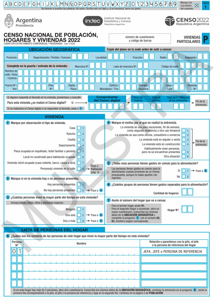 El Instituto Nacional de Estadística y Censos (Indec) presentó el cuestionario definitivo del Censo Nacional de Población, Hogares y Viviendas 2022 formado por 61 preguntas, 24 relacionadas con las características de las viviendas y los hogares, y 37 sobre la estructura de la población.