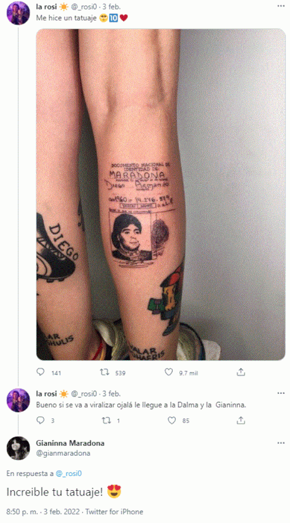 El dibujo grabado en la zona del gemelo de la pierna derecha muestra muy nítidamente los principales datos personales del “Pelusa”, además de su foto, firma y su huella dactilar con el pulgar izquierdo. “Cuando le hice el pedido a mi tatuadora, ella se mostró muy entusiasmada, y eso ayudó mucho. Y cuando terminó de hacerme el tatuaje no podía creer lo bien que había quedado”, recordó la fanática de Maradona.