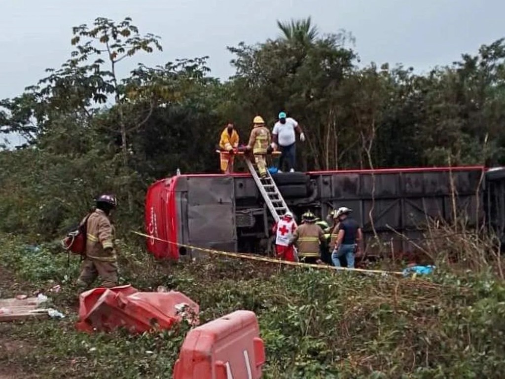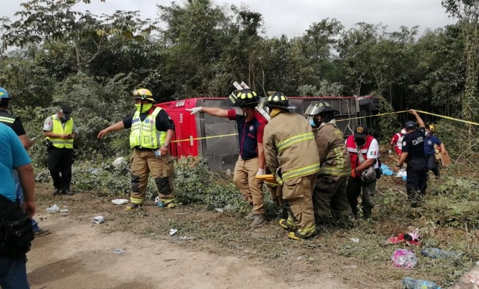 Según información preliminar, el autobús volcó tras impactar contra un camión de carga que trabajaba en las obras del tren turístico Maya que construye el Gobierno en la zona.