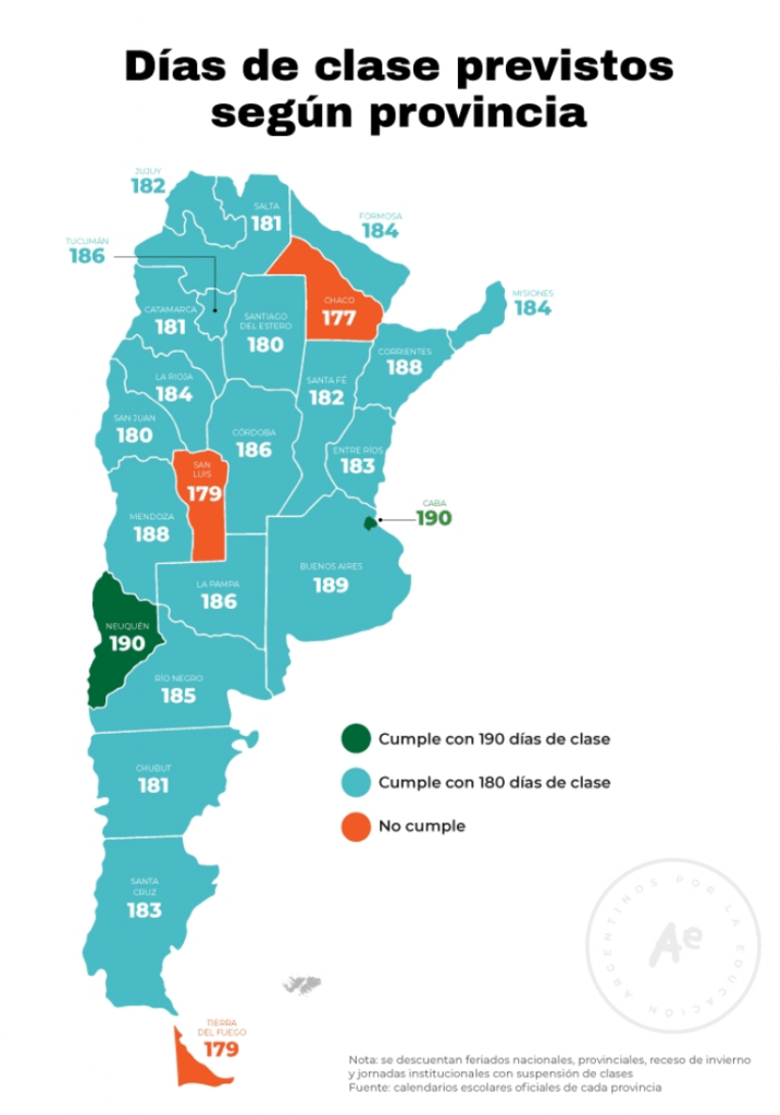 La normativa del Consejo Federal de Educación establece un piso superior (190 días) al de la Ley 25.864 de 2003, que fijó un mínimo de 180 días de clase. Si se descuentan sólo los días de vacaciones y los feriados nacionales y provinciales, todos los calendarios alcanzan los 180 días. Si además se descuentan las jornadas institucionales, Chaco (177), San Luis (179) y Tierra del Fuego (179) no alcanzan los 180 días de clase desde la planificación misma. Estos números independientemente de los días que luego se puedan perder por diferentes causas, como problemas edilicios, paros docentes, factores climáticos, entre otras.