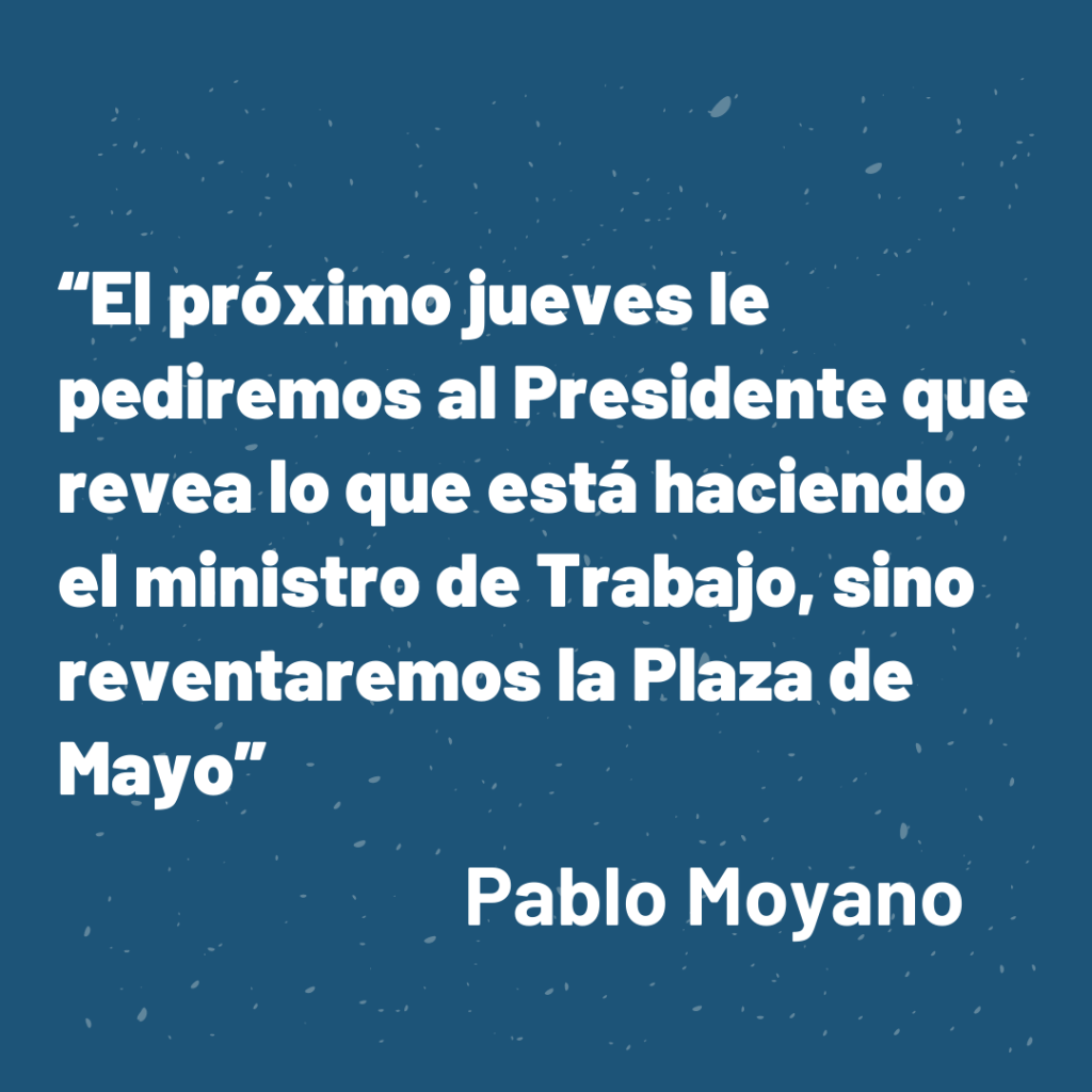 “Hay que decirle al ministro de Trabajo de la Nación, el señor Moroni, quien le va a reponer los 19.500 pesos que le sacó la empresa Dorinca a un trabajador por contagiarse de COVID ¿Vas a ser vos Moroni o tus amigos de la ART?”, dijo.
