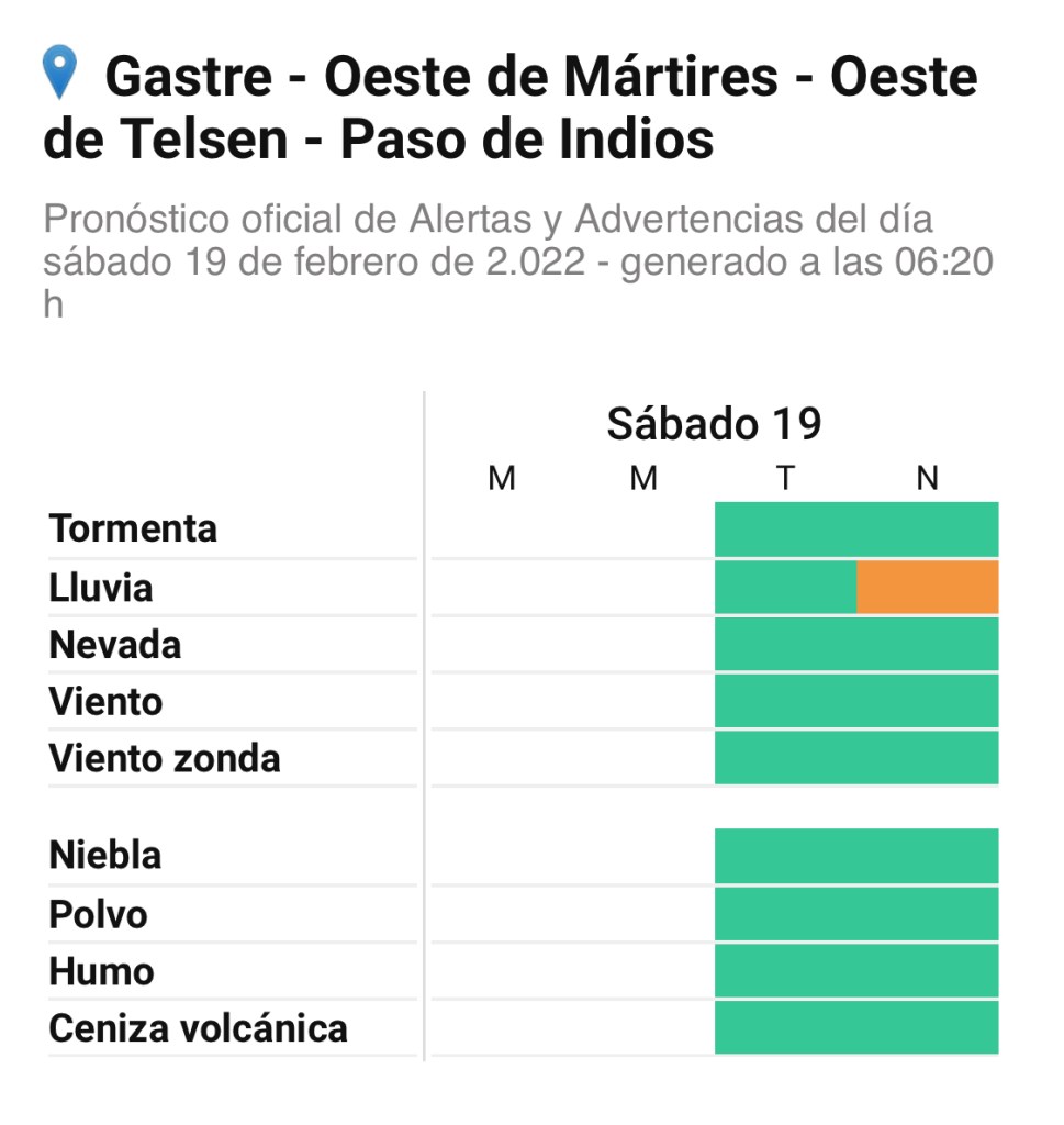 El alerta naranja, que arranca a la tarde de hoy incluye la zona de Gastre, Oeste de Mártires, Oeste de Telsen y Paso de Indios.