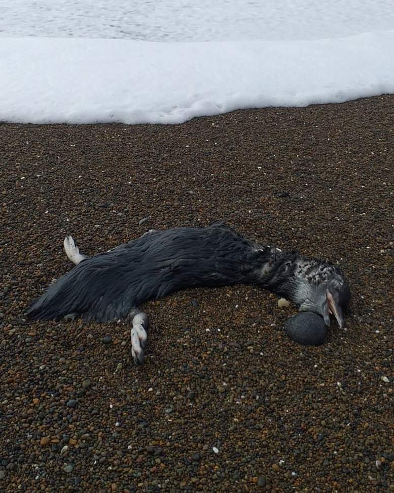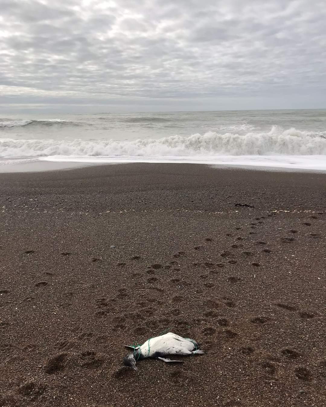 Hoy encontramos en sectores 2 y 3 entre 6 y 10 pingüinos muertos en la costa . Algunos con restos de residuos plásticos en su cuello. Situación inusual que seguramente será investigada por los especialistas de fauna marina.
