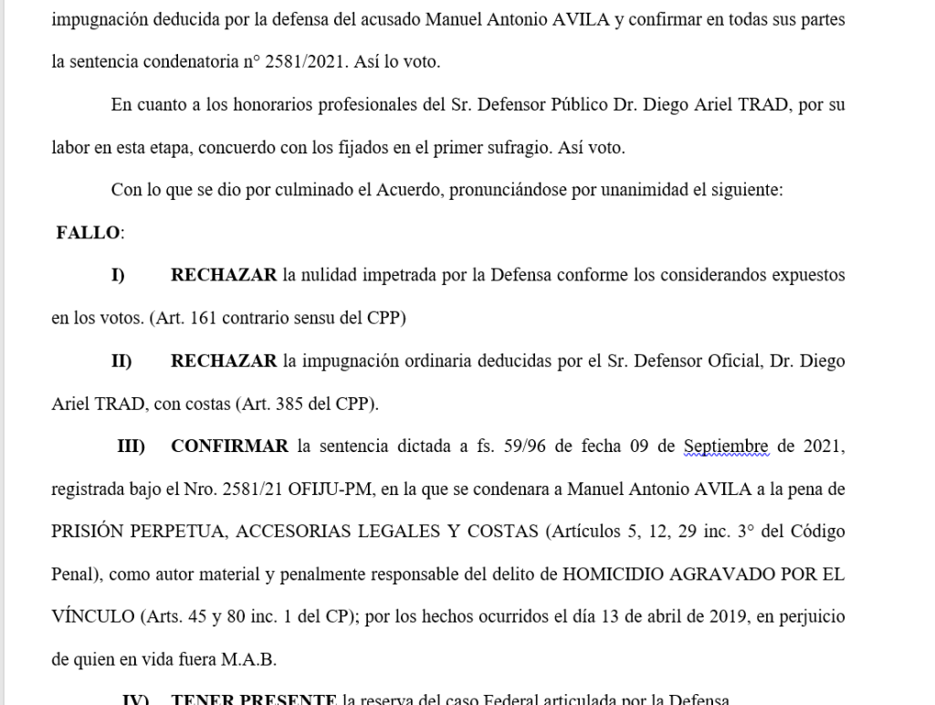 La fiscalía de Puerto Madryn informó que el fallo fue a dado a conocer por los camaristas Rafael Lucchelli, Flavia Trincheri y Leonardo Pitcovsky, quienes dejaron firme la pena de prisión perpetua para el condenado.