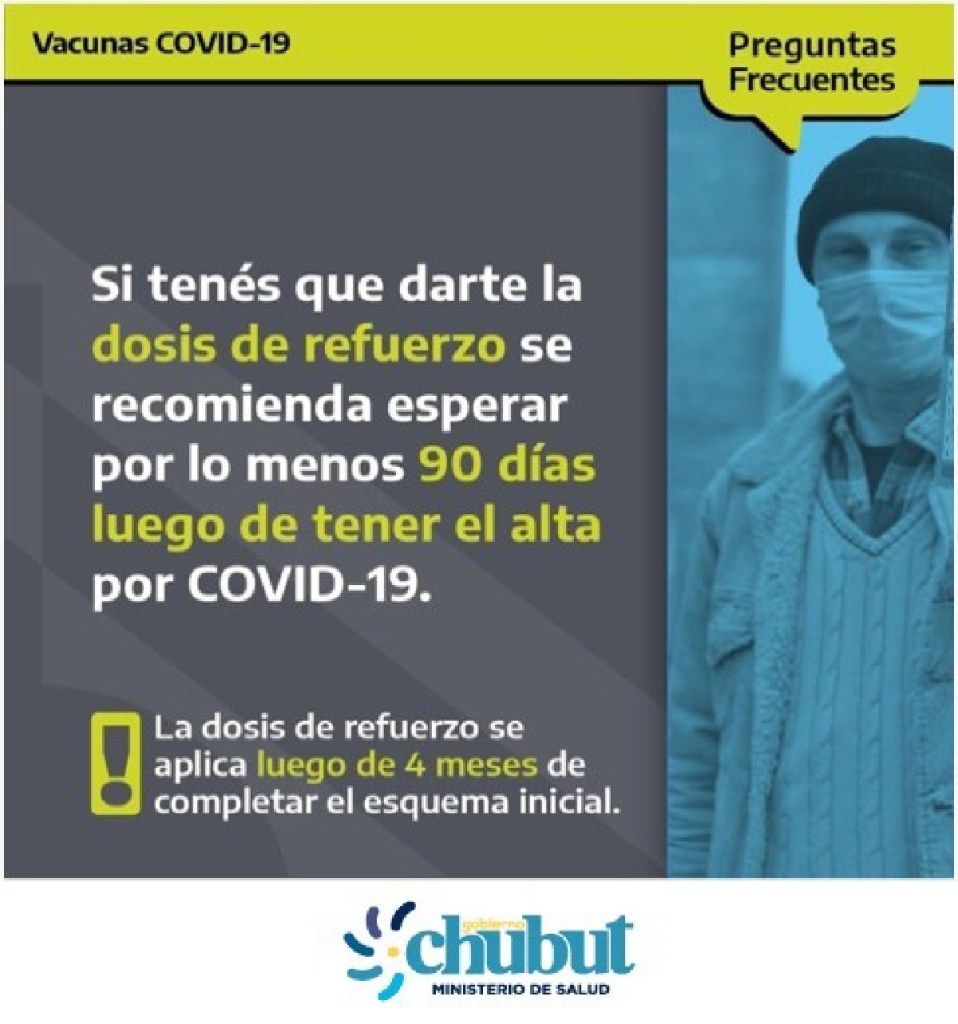 El Ministerio de Salud del Chubut, que conduce Fabián Puratich, a través de la Dirección Provincial de Patologías Prevalentes y Epidemiología, informó a toda la comunidad provincial que aquellas personas que hayan atravesado el Covid-19 recientemente, y no hubieran completado todavía sus esquemas de vacunación iniciales, podrán concurrir de forma espontánea al vacunatorio más cercano para colocarse la primera o la segunda dosis de la vacuna contra el Covid-19, en cuanto tengan el alta epidemiológica correspondiente.