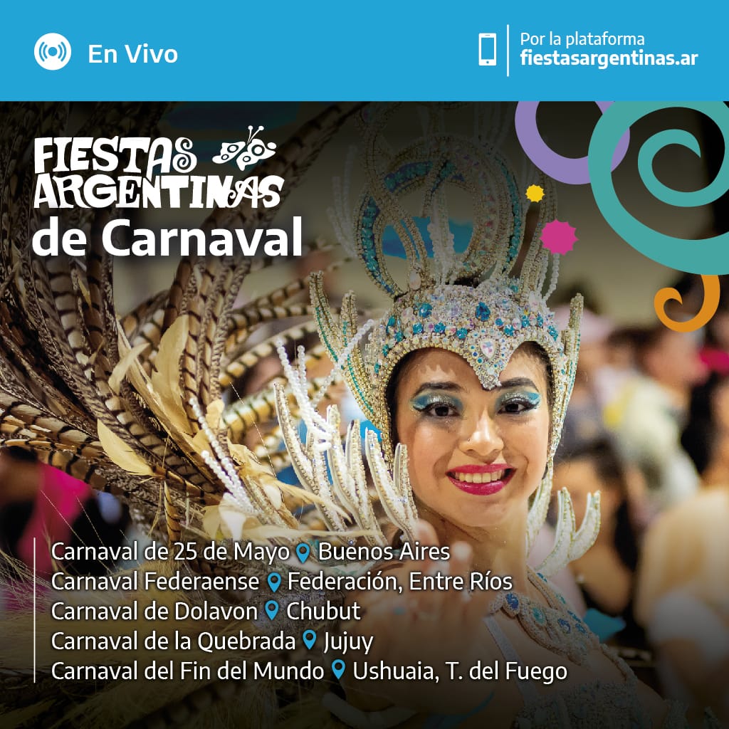 A través de la plataforma virtual www.fiestasargentinas.ar, desde las 22:30 horas, el Carnaval de Dolavon será transmitido en vivo para todo el mundo mostrando todo el color y la alegría de los corsos más famosos de la Patagonia.