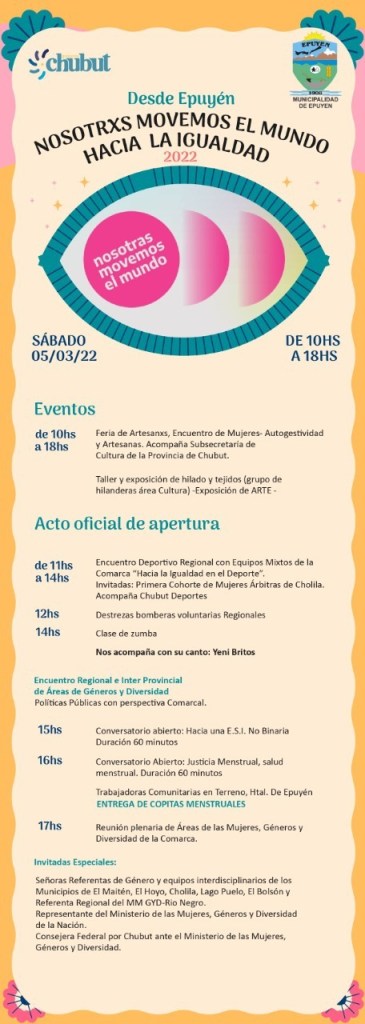 Las actividades se desarrollarán en Chubut mayoritariamente desde el martes 2 al lunes 7 de marzo y culminará el día 8M. En algunas localidades las actividades se extenderán a lo largo de todo el mes de marzo.
