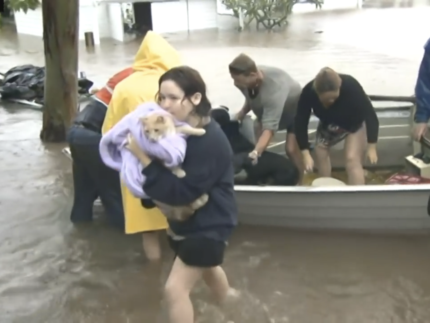 Ella y su pareja lograron subir al techo del edificio, donde personas que pasaron en kayak les ayudaron a subir a un improvisado bote de rescate.