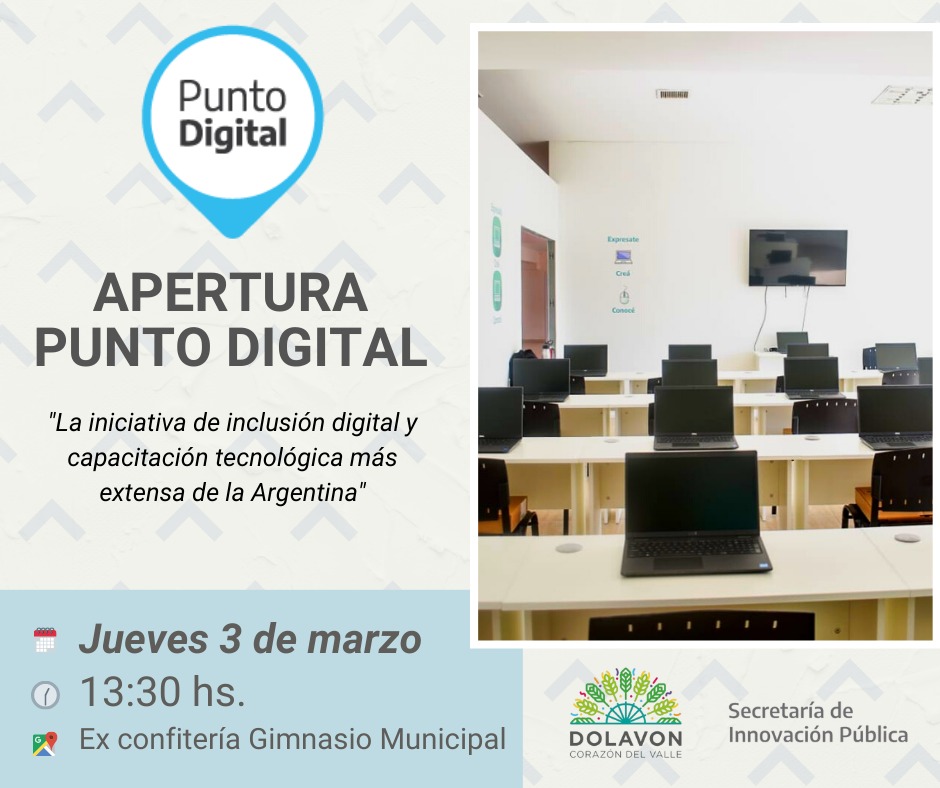 El jueves 3 de marzo, a las 13:30 horas, en las instalaciones de la ex confitería del gimnasio municipal se inaugurará el Punto Digital de Dolavon con la presencia del intendente Dante Bowen junto a funcionarios/as del Gobierno Nacional, alumnos/as, docentes y directoras de los establecimientos escolares de la localidad de las norias.