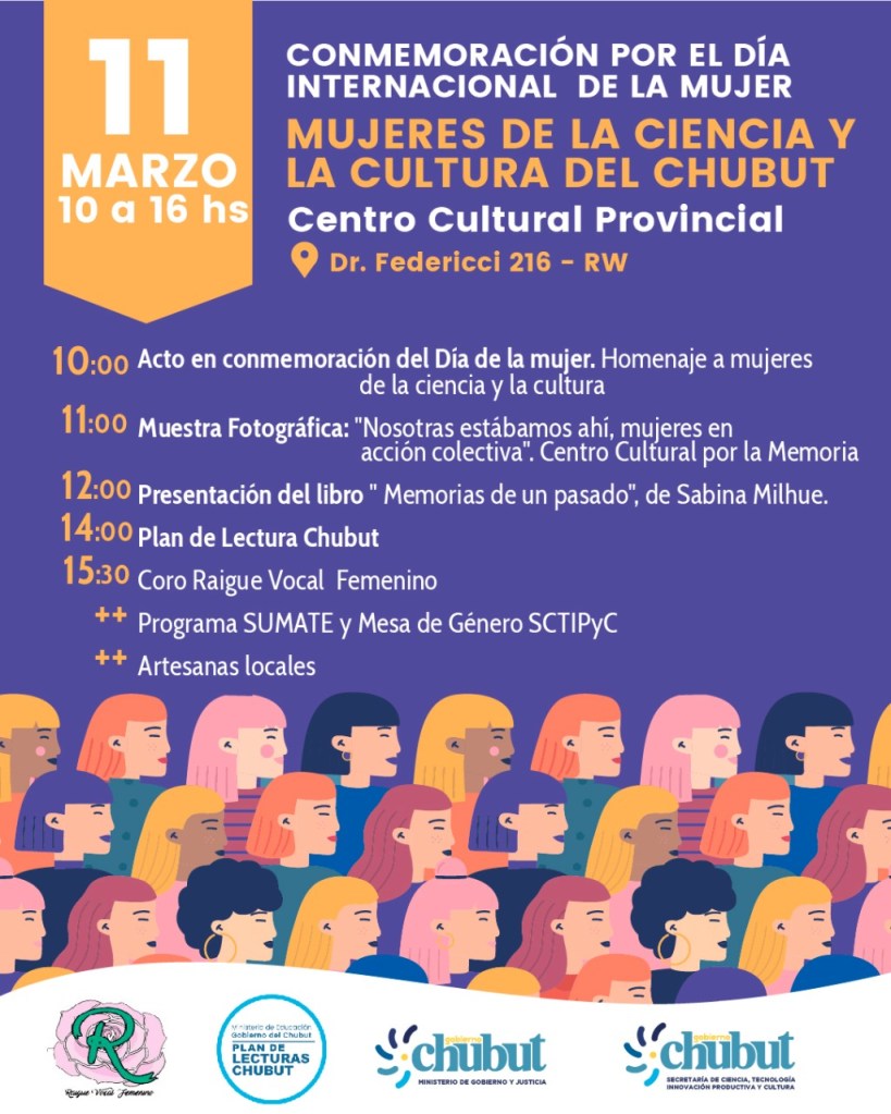 La Secretaría de Ciencia, Tecnología, Innovación Productiva y Cultura conmemorará el Día Internacional de la Mujer con una jornada de actividades que se realizará el viernes 11 en el Centro Cultural Provincial de Rawson, a partir de las 10 de la mañana.