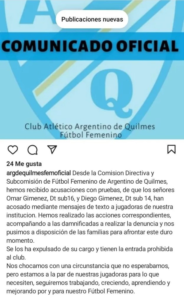 Dos entrenadores de las categorías SUB 16 y 14 de fútbol femenino del Club Atlético Argentino de Quilmes fueron expulsados de la institución tras las acusaciones por acoso de algunas jugadoras, quienes aseguraban que ambos acusados «les pedían imágenes, les sacaban fotos en los entrenamientos o las descargaban de sus redes sociales para enviarlas a un grupo de WhatsApp en el que había otros hombres», contó la madre de una de las víctimas.