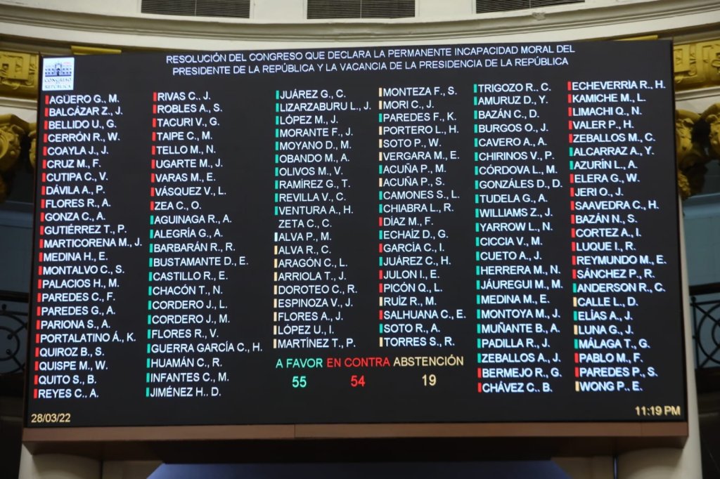 Tras un extenso debate de más de ocho horas en el Congreso unicameral, en el que el mandatario presentó sus descargos antes de que 95 parlamentarios hicieran uso de la palabra, solo 55 legisladores votaron a favor de la destitución, 54 en contra y 19 se abstuvieron.