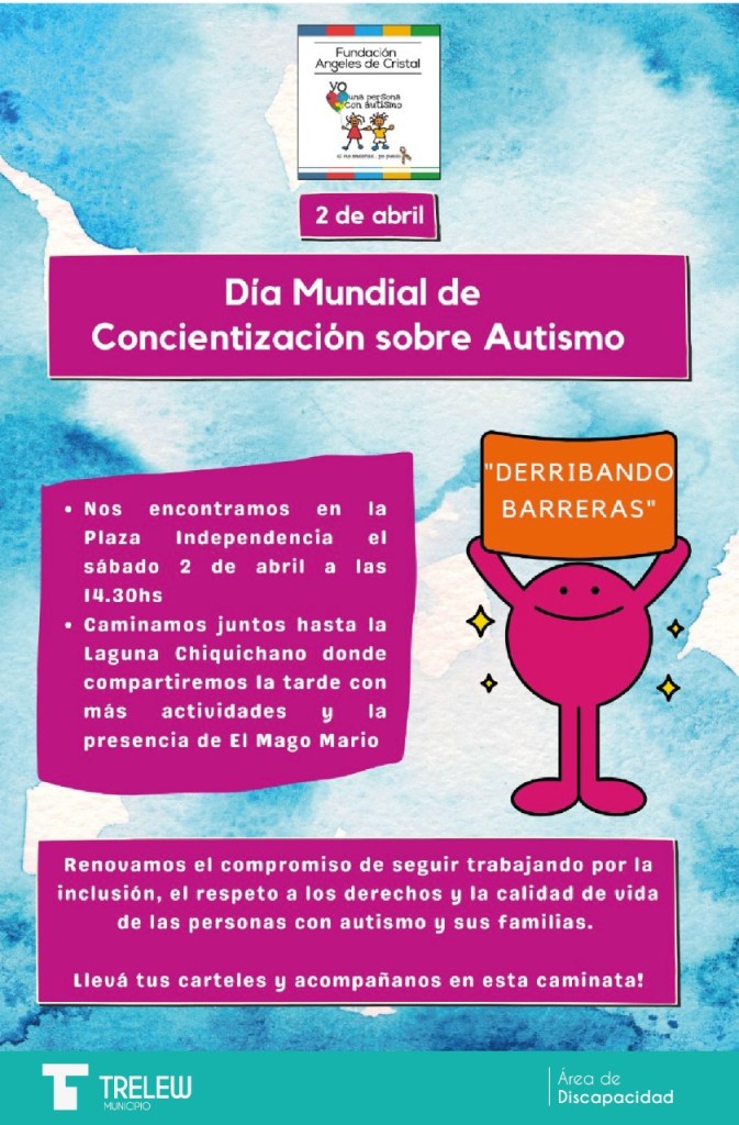 La Municipalidad de Trelew a través de la Secretaría de Desarrollo Social y Acción Comunitaria acompañará a la fundación Ángeles de Cristal en el Día Mundial de la concientización sobre el espectro autista que se conmemora cada 2 de abril. La actividad comenzará a las 14:30 con una caminata y finalizará en la reserva natural Laguna Cacique Chiquichano con una jornada recreativa para toda la familia.