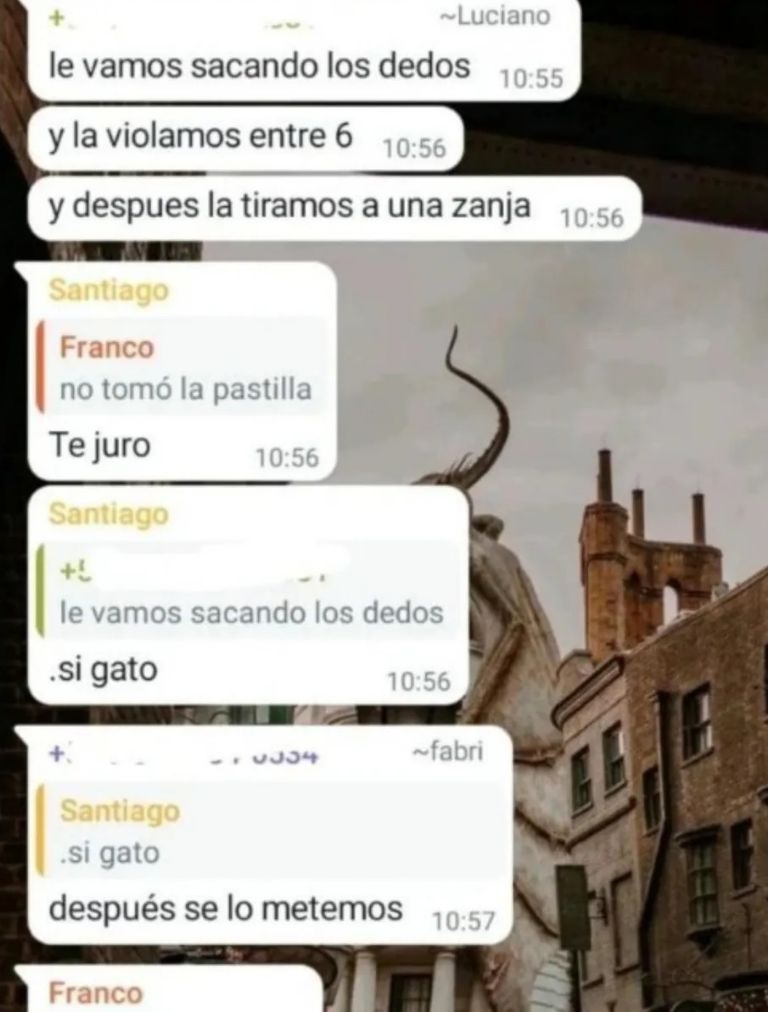 En concreto, fue otro compañero quien leyó en un grupo de WhatsApp lo que planeaban hacerle y la alertó. «Me habló y me contó todo lo que sabía. Al enterarme de las cosas que estaban escritas, fui contarle a los directivos del colegio». Si bien los jóvenes hablan de una violación entre seis (con la totalidad de los participantes del grupo), el chico que tomó las capturas le explicó que se trataba de tres varones.