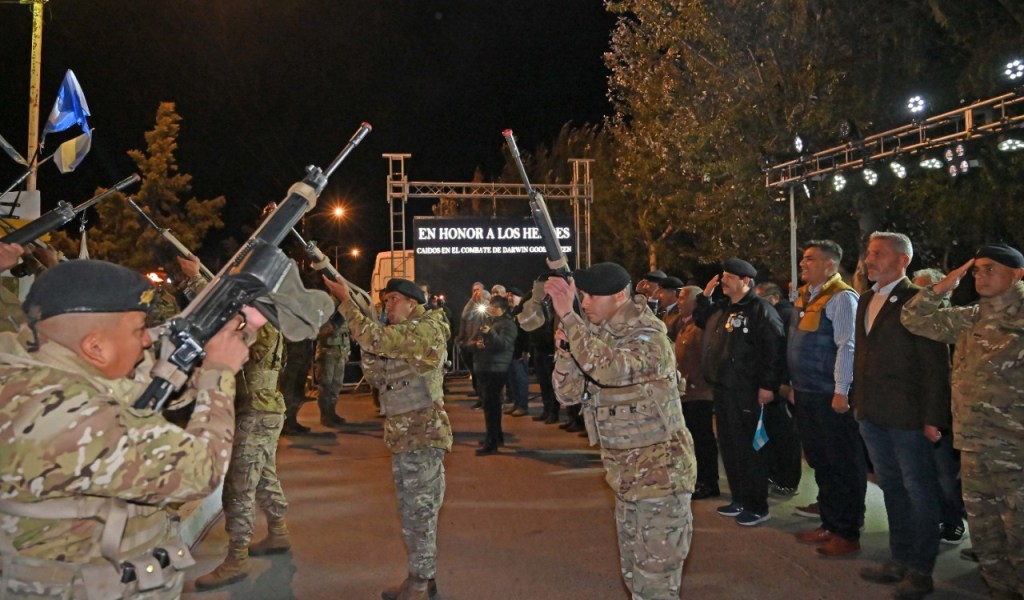 El Gobernador junto al Intendente y ex Combatientes y Veteranos de Malvinas, realizaron la procesión de antorchas con la guía de la banda militar Combate de San Carlos, por calle 20 de junio hasta la Avenida San Martin y Fontana.