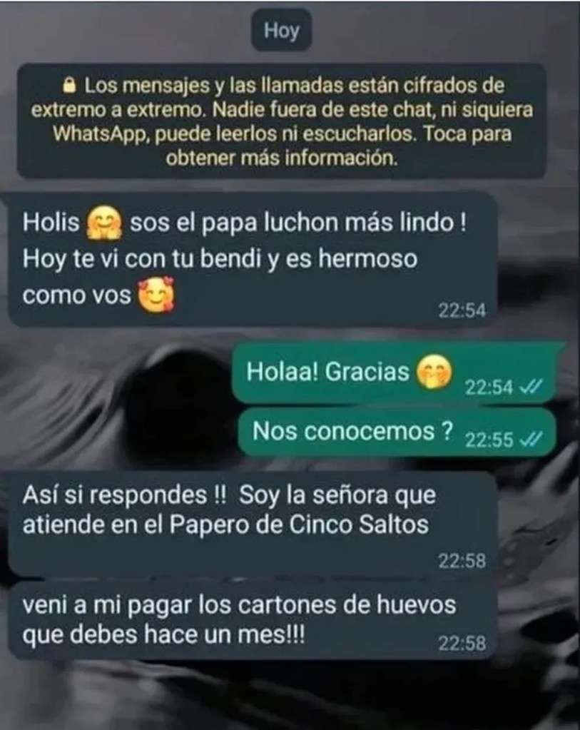 “Holis. ¡Sos el papá luchón más lindo! Hoy te vi con tu bendi y es hermoso como vos”, le escribió por WhatsApp la mujer del comercio a través de otro número. Y de forma instantánea él le respondió. “Hola, gracias. ¿Nos conocemos?”.
