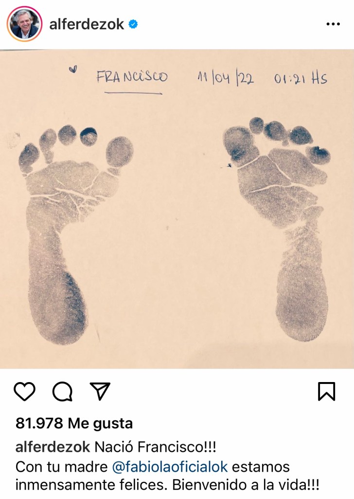 «Nació Francisco!!!, Con tu madre @fabiolaoficialok estamos inmensamente felices. Bienvenido a la vida!!!”, escribió el presidente en su cuenta de Instagram, con una foto en la que pueden verse las huellas de los pies del bebé.