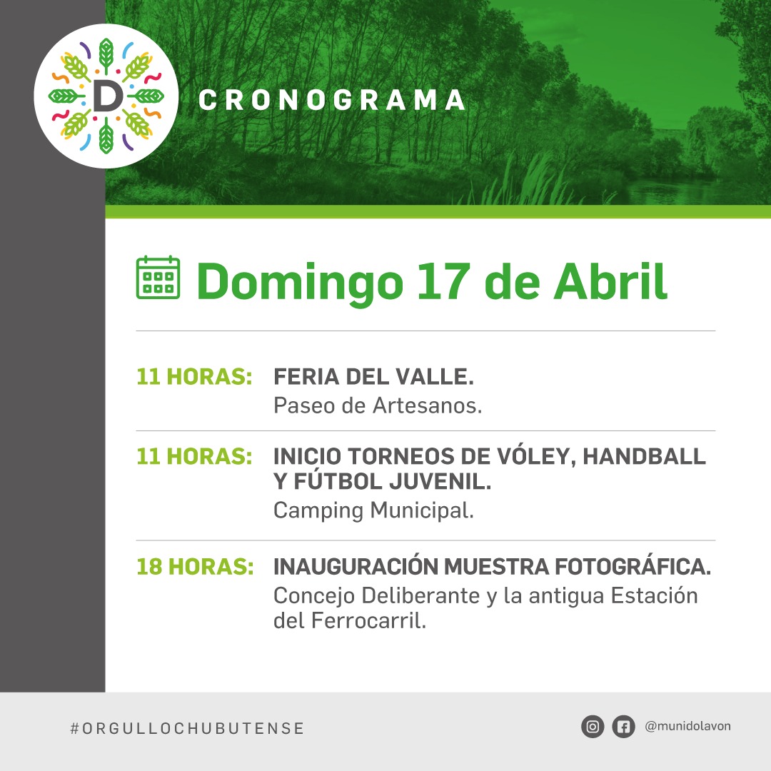 Para el domingo 17 de abril, a las 11 horas, se programó la Feria del Valle en el Paseo Artesanal y, paralelamente, comenzarán los torneos de vóley, handball y fútbol juvenil en el camping municipal. A las 18 horas quedará habilitada la muestra fotográfica en el Concejo Deliberante y la antigua Estación del Ferrocarril.