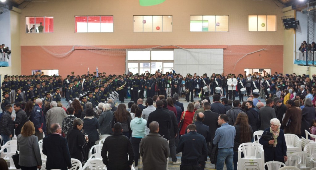 La banda de música de la Policía de la Provincia de Chubut regaló a los presentes un carrusel dentro del gimnasio municipal porque por el clima se suspendió el tradicional desfile cívico – militar.
