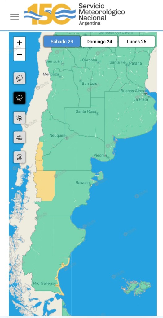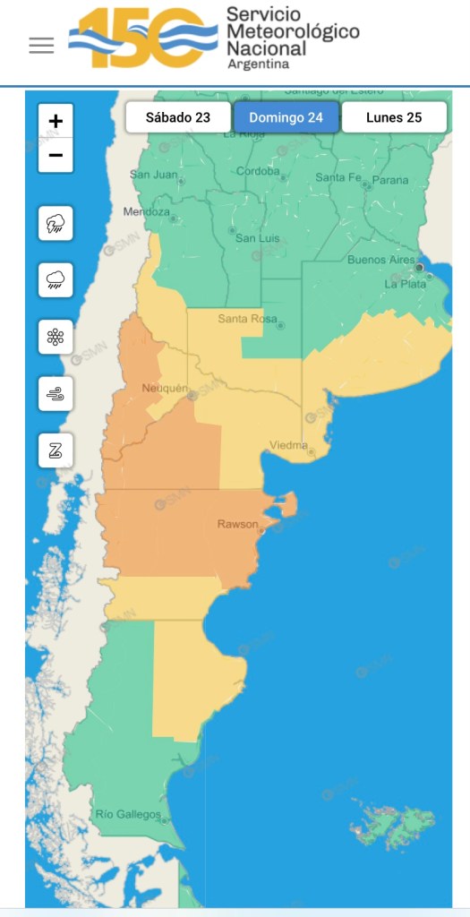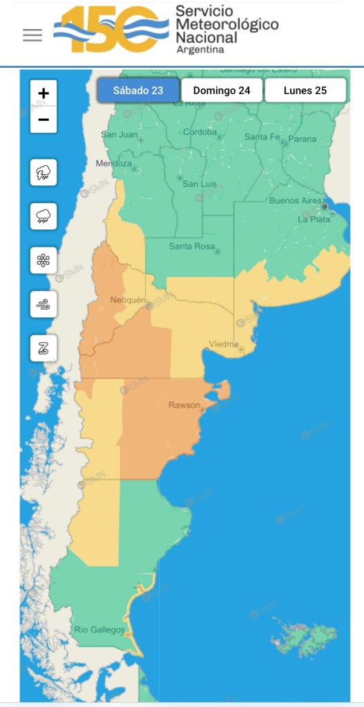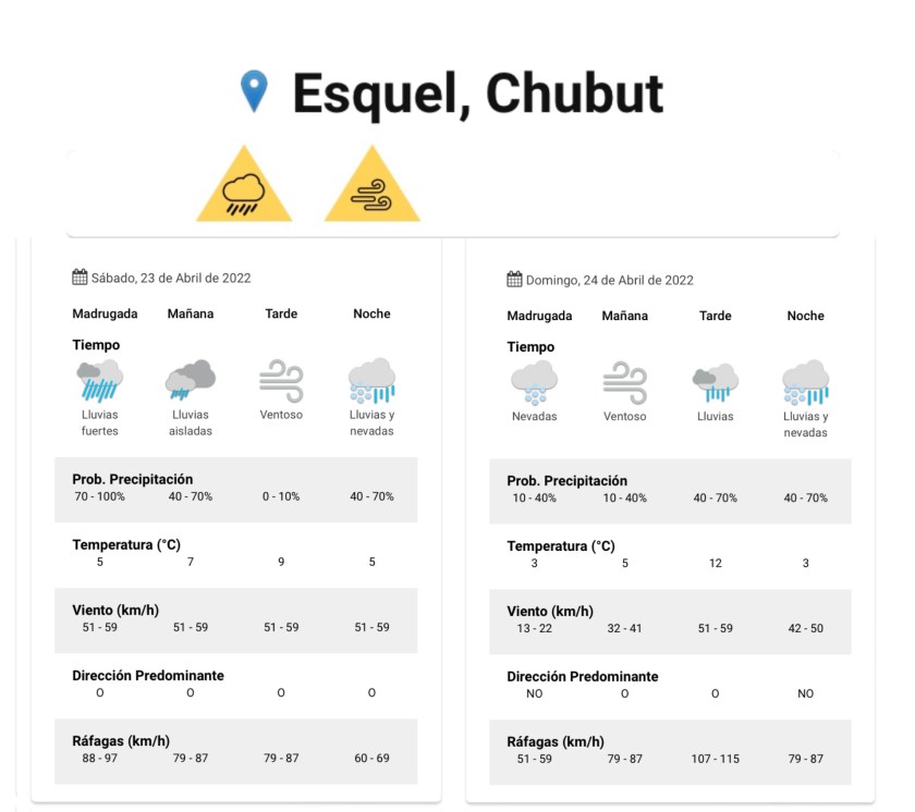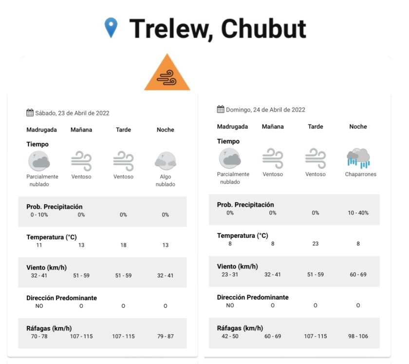 Según el SMN por la mañana y la tarde el día sábado toda la zona este y centro de la provincia y la comarca andina del paralelo 42 se verá afectada por vientos del sector oeste con velocidades entre 65 y 75 km/h, con ráfagas que pueden superar los 120 km/h.