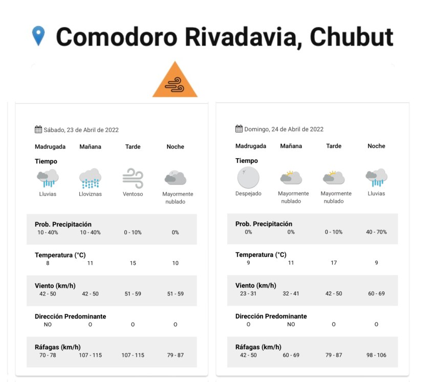 El Servicio Meteorológico Nacional ha emitido un alerta naranja por fuertes vientos que abarcará la mayoría de la provincia del Chubut y se extenderá durante el fin de semana. Se pronostican ráfagas que pueden llegar a superar los 120km/h.