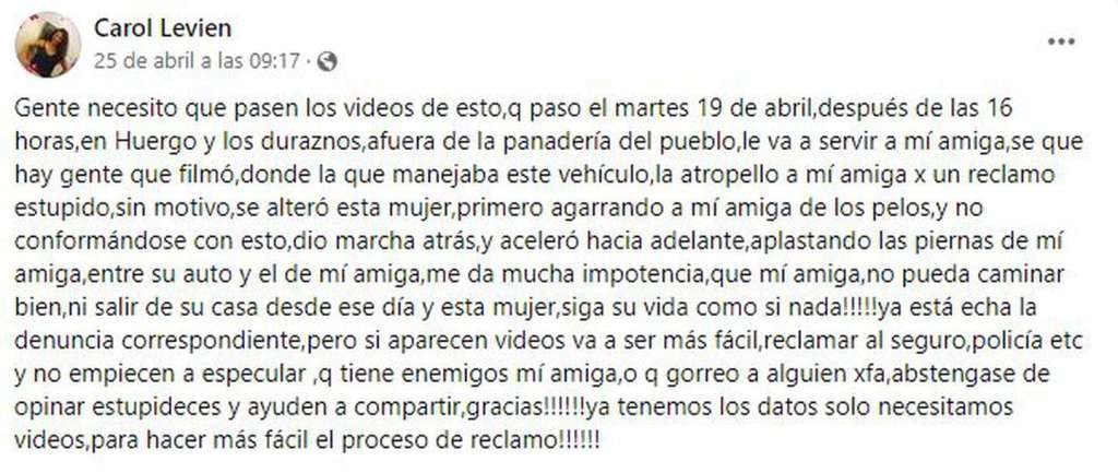 Por último, la amiga de la mujer atropellada pidió a través del mismo posteo en Facebook testigos que puedan aportar videos, con el objetivo de facilitar el proceso del reclamo.