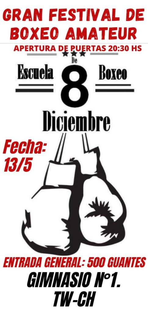El próximo viernes 13 de mayo, en el Gimnasio Municipal N°1, se vivirá una nueva velada de boxeo amateur en Trelew, organizada por la Escuela «8 de Diciembre», con el apoyo de la Coordinación de Deportes de la Municipalidad de Trelew.