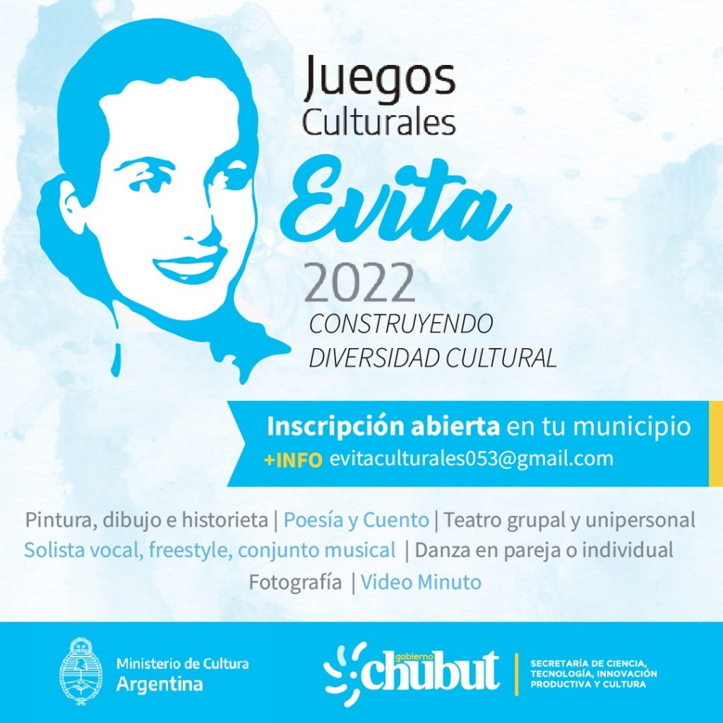 El Gobierno del Chubut, a través de la Secretaría de Ciencia, Tecnología, Innovación Productiva y Cultura, informa a la comunidad que ya se encuentra disponible la inscripción a la Edición 2022 de los Juegos Culturales Evita, la cual estará abierta hasta el próximo martes 23 de agosto inclusive.