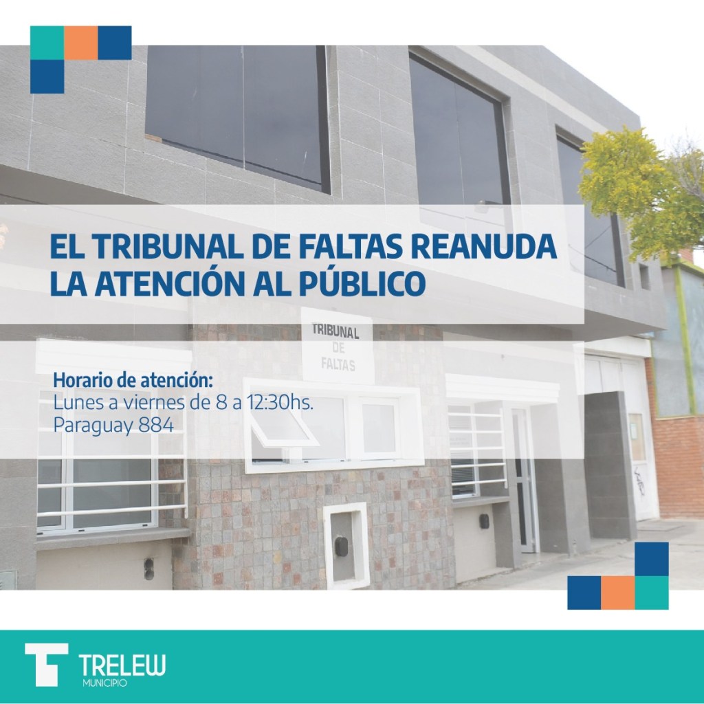 El Tribunal de Faltas de la Municipalidad de Trelew informa que a partir del 1 de febrero reanudará la atención al público en su horario habitual de lunes a viernes de 8 a 12.30 horas en sus oficinas de Paraguay 884 para trámites y consultas.