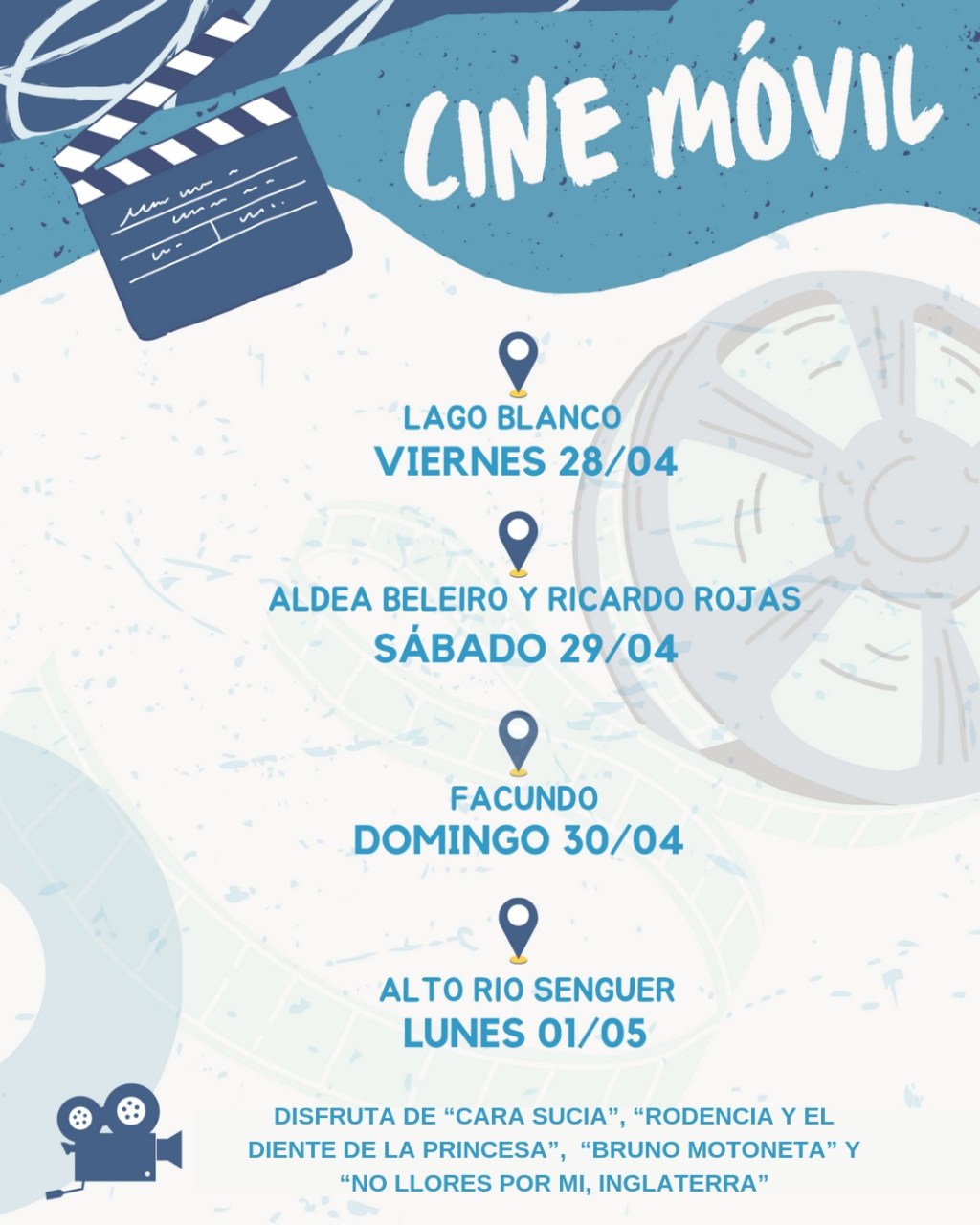 La Secretaría de Ciencia, Tecnología, Innovación Productiva y Cultura del Chubut informa que el Programa “Cine Móvil” comenzó hoy una nueva recorrida por toda la Provincia. Este viernes 28 están establecidos en la localidad de Lago Blanco. Mañana, sábado 29, visitará Aldea Beleiro y Ricardo Rojas; el domingo 30 de abril Facundo y el 1 de Mayo Alto Río Senguer.