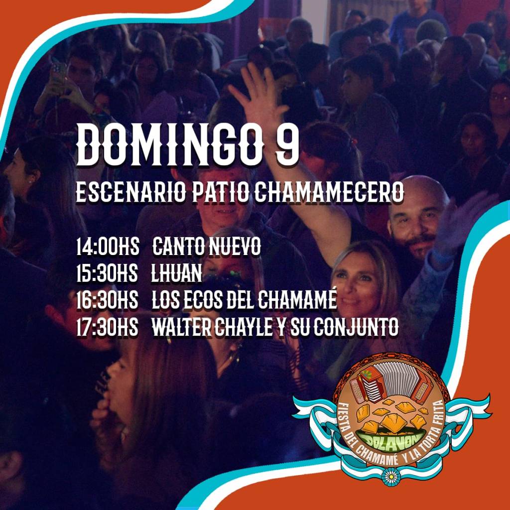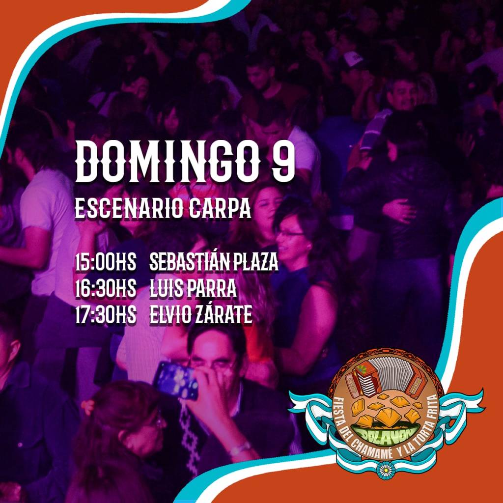 El escenario del “Patio Chamamecero” tendrá los espectáculos de Canto Nuevo, Lhuan, Los Ecos del Chamamé y Walter Chayle y su conjunto, mientra que la carpa gigante se escuchará a Sebastián Plaza, Luis Parra y Elvio Zárate.