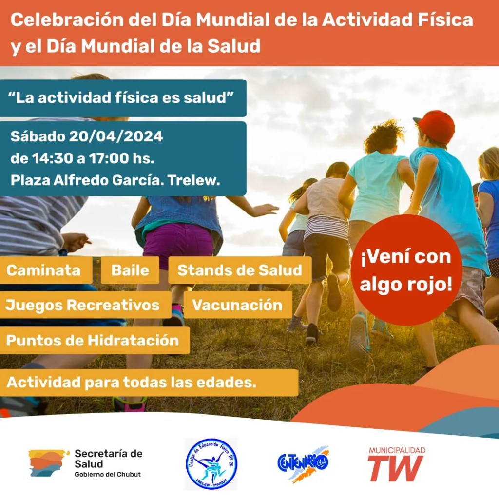 El Gobierno del Chubut, a través de la Secretaría de Salud provincial, invita a toda la comunidad a participar del evento denominado “La Actividad Física es Salud”, que se llevará a cabo este sábado 20 de abril, a partir de las 14:30 horas, en la plaza “Alfredo García” de Trelew.
