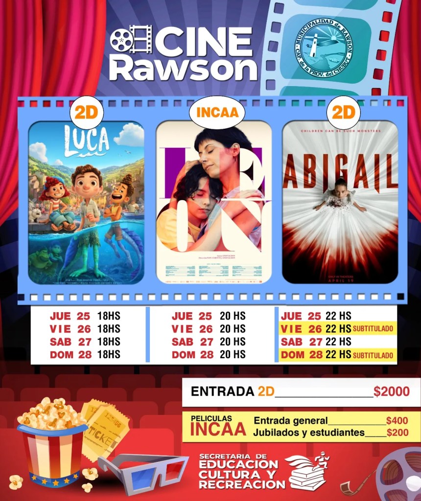 Los vecinos de la ciudad de Rawson y visitantes podrán disfrutar del film infantil “Luca” en 2D podrán disfrutar del film infantil; “León” del Espacio INCAA; y de la proyección internacional “Abigail” en 2D.