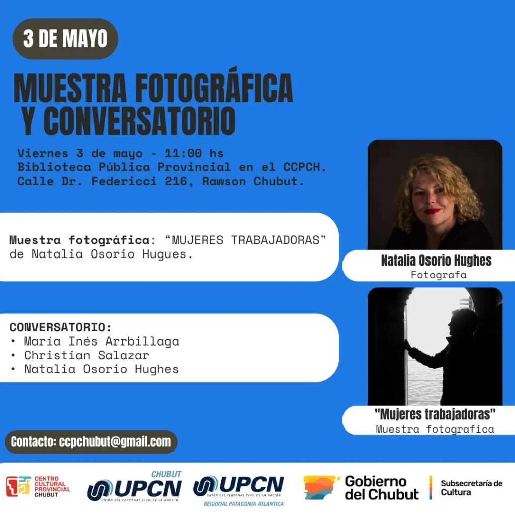 El Gobierno del Chubut, que encabeza Ignacio “Nacho” Torres, a través de la Subsecretaría de Cultura y gracias a un trabajo en conjunto con el gremio UPCN, invita a disfrutar del lanzamiento de la Muestra Fotográfica “Mujeres Trabajadoras” que se realizará este viernes 3 de mayo desde las 11 horas en la Biblioteca Pública Provincial “Presbítero Bernardo Vacchina”, ubicada dentro del Centro Cultural Provincial de Rawson.
