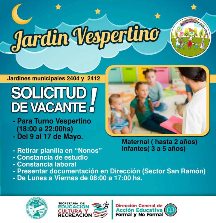 La Municipalidad de Rawson a través de la Dirección General de Acción Educativa Formal y No Formal, continúa con las inscripciones para el turno vespertino de los Jardines Municipales. Los ciclos disponibles son Maternal (hasta 2 años de edad) e infantes (3 a 5 años).