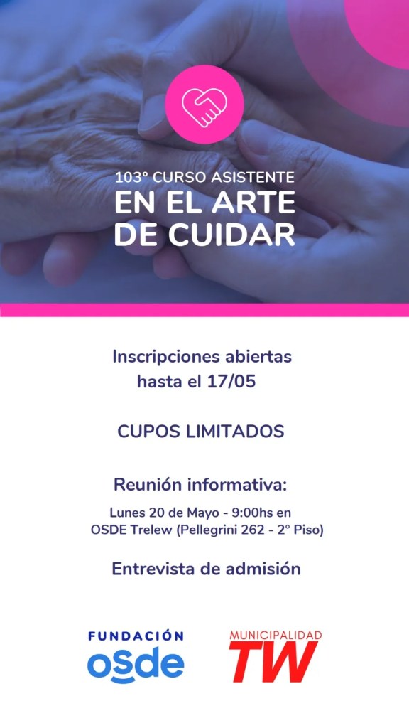 La Municipalidad de Trelew, en forma conjunta con la Fundación OSDE, dictarán a partir del 1 de julio el “Curso asistente en el arte de cuidar”.