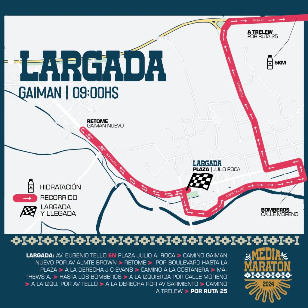 Con el acompañamiento de la Municipalidad de Trelew, por intermedio de la Coordinación de Deportes, este domingo desde las 9 se largará la undécima edición de la tradicional corrida “21K Día de la Patria”, organizada por “Haro Team”. El inicio de la prueba principal está previsto a las 9, desde la plaza central de Gaiman. Media hora después se iniciará una prueba de 5K, que largará en el Parque Industrial. Se concluye frente al Palacio Municipal de Trelew.