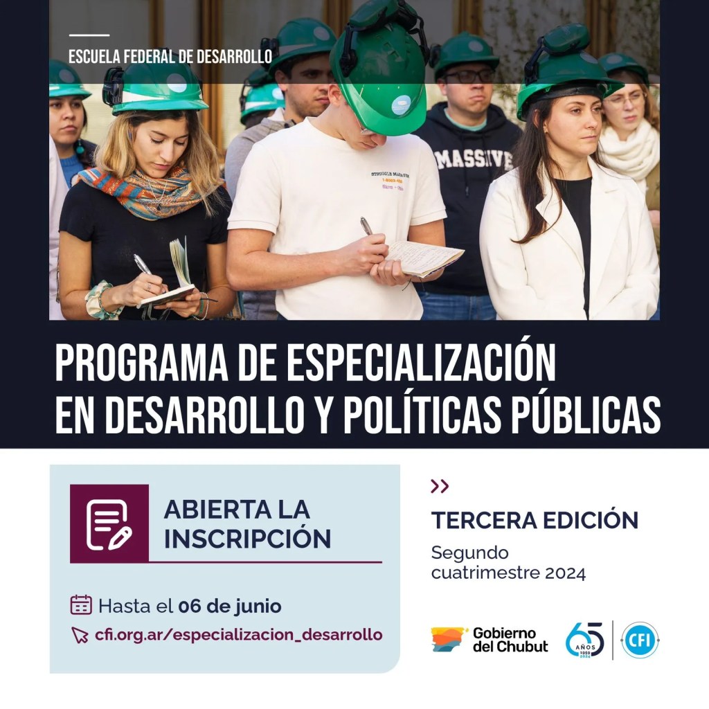 La Secretaría General de Gobierno, dependiente del Gobierno del Chubut que encabeza Ignacio “Nacho” Torres, invita a la comunidad a participar de la tercera edición del Programa de Especialización en Desarrollo y Políticas Públicas del CFI.
