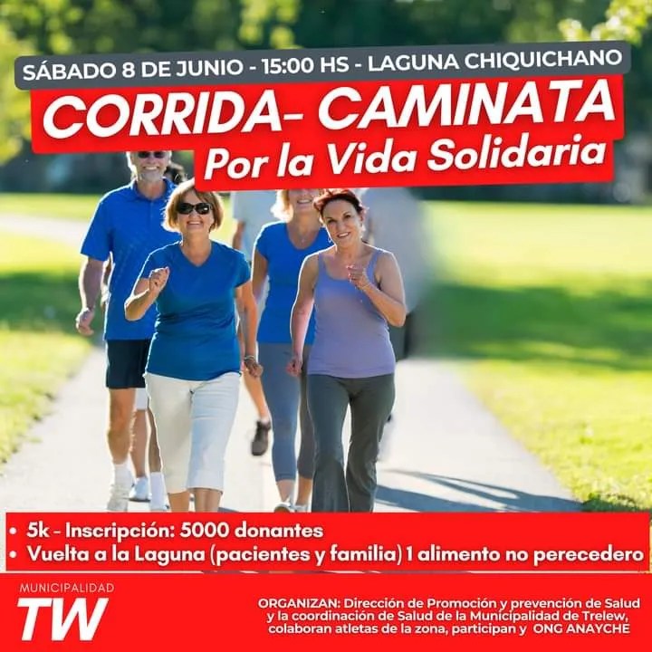 Con la organización de la Municipalidad de Trelew, a través de la Coordinación de Salud, la Dirección provincial de Promoción y Prevención de la Salud, la Asociación Civil Anayche y atletas de la zona, el sábado 8 de junio se realizará en el predio de la laguna Cacique Chiquichano la actividad solidaria «Corrida-Caminata por la Vida».