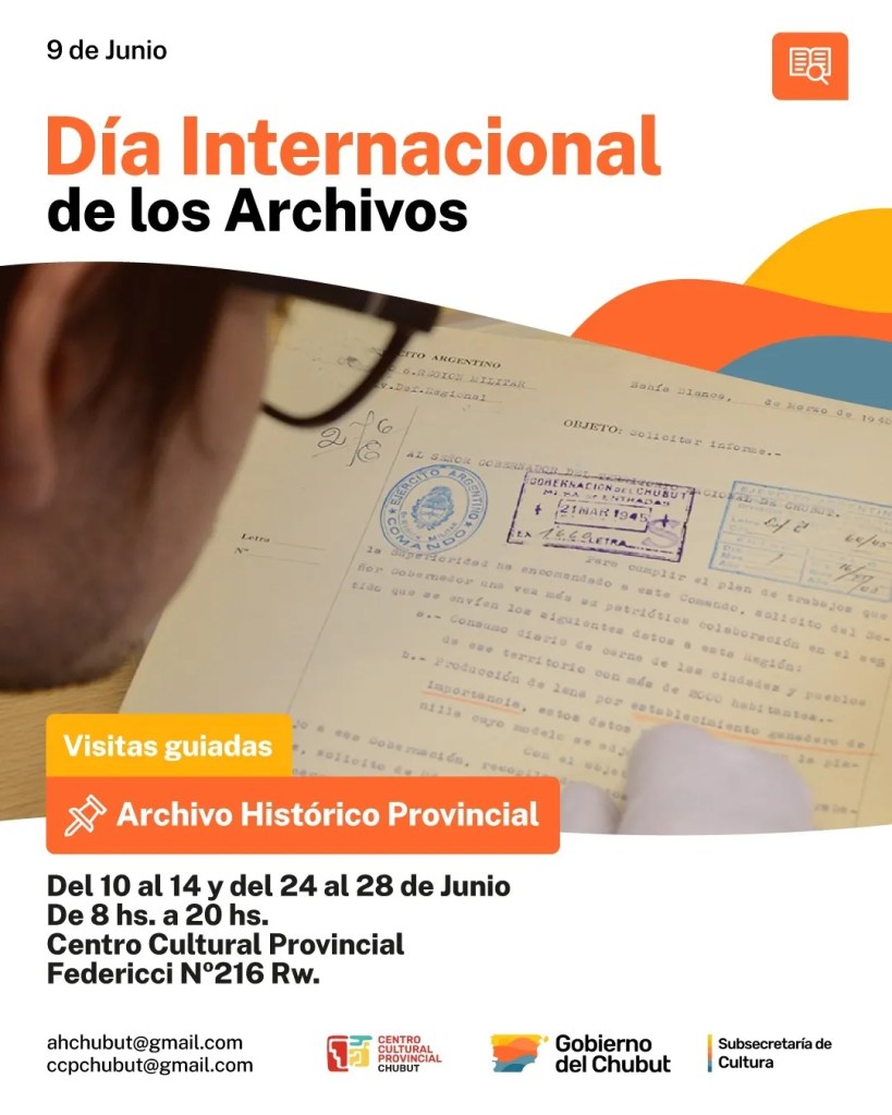 La Dirección General del Centro Cultural Provincial, dependiente del Gobierno del Chubut, que conduce Ignacio «Nacho» Torres, brinda visitas guiadas al Archivo Histórico Provincial, como parte de las actividades conmemorativas al Día Internacional de los Archivos, celebrado el pasado 9 de junio.