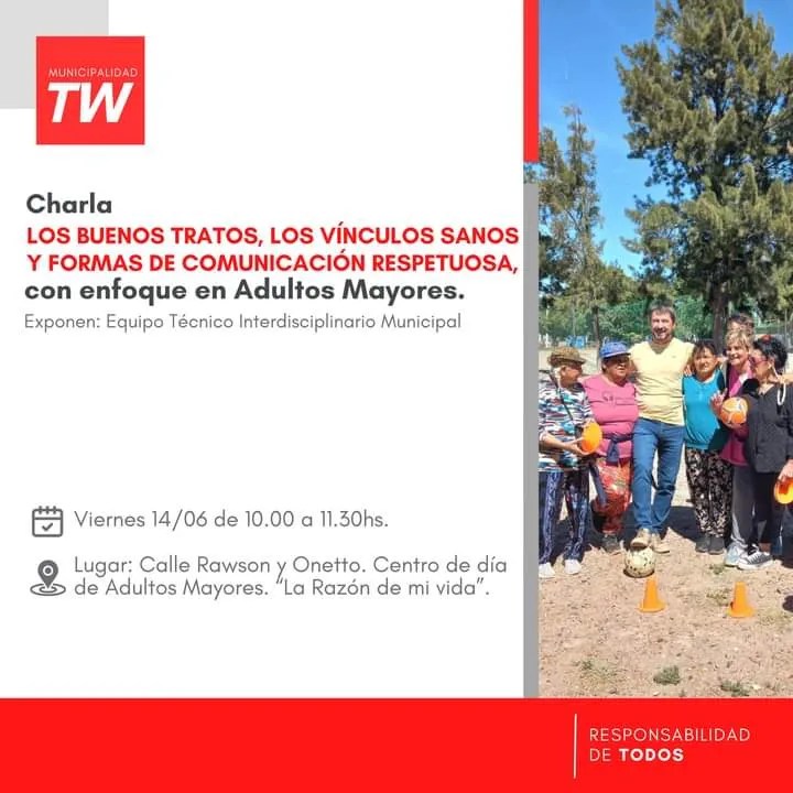 La charla estará a cargo del Equipo Técnico Interdisciplinario Municipal y será sobre la temática “Los buenos tratos, los vínculos sanos y formas de comunicación respetuosa” con enfoque en adultos mayores.