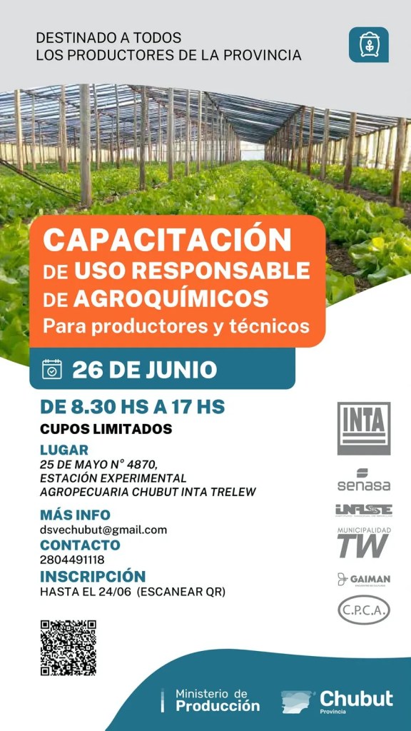 El Gobierno de la Provincia, que encabeza Ignacio «Nacho» Torres, a través del Ministerio de Producción junto a INTA Chubut, convoca a productores agropecuarios y técnicos una jornada de capacitación gratuita sobre Uso Responsable de Agroquímicos.