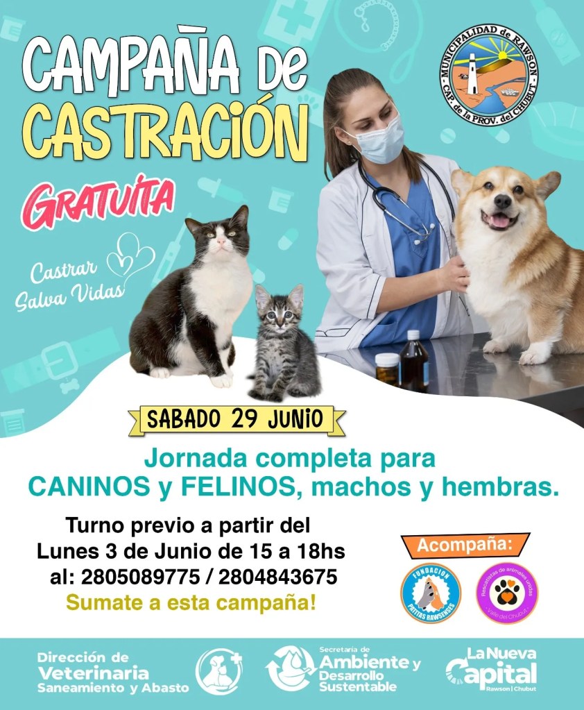 En este aspecto, la responsable del área, Noelia Sánchez, comentó que “desde el área de Veterinaria Municipal estamos convocando a todos aquellos vecinos y vecinas de Rawson y Playa Unión que deseen esterilizar a sus animales”.