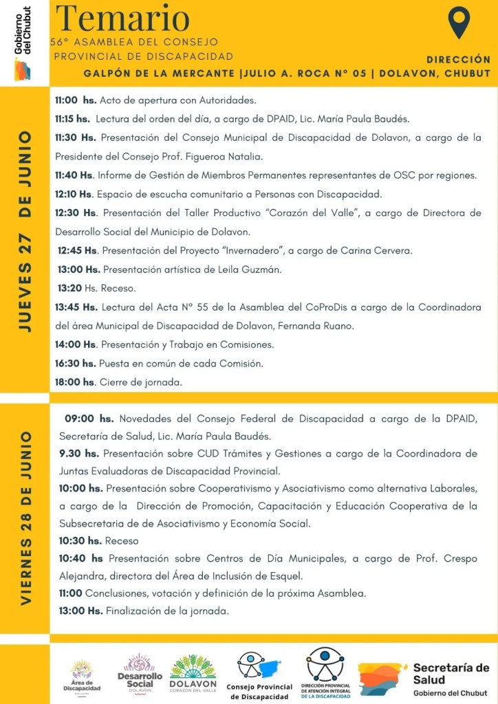 El programa de actividades a desarrollar incluye, para el día jueves 27 de junio, los siguientes puntos: lectura del orden del día, a cargo de la directora provincial de Atención Integral de la Discapacidad, licenciada Paula Baudés; presentación del Consejo Municipal de Discapacidad de Dolavon, por parte de su presidente, profesora Natalia Figueroa; y presentación del informe de gestión de miembros permanentes que son representantes de Organizaciones de la Sociedad Civil (OSC) por regiones.
