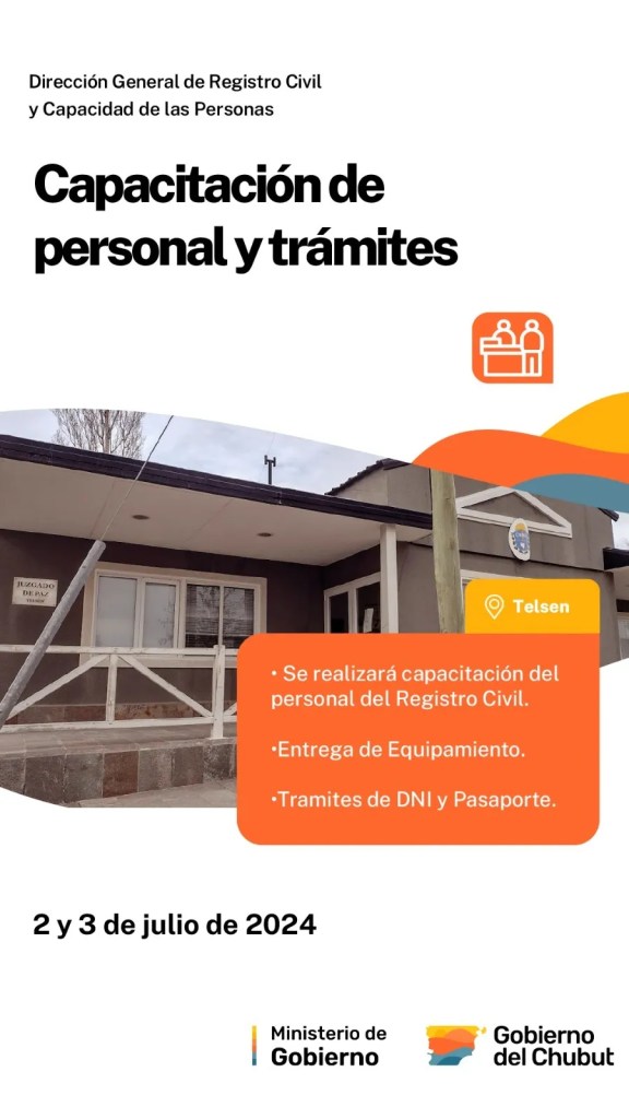 En el marco de las políticas impulsadas por el gobernador del Chubut, Ignacio “Nacho” Torres, en relación a la correcta formación del recurso humano en el estado provincial, a través de la Dirección General de Registro del Estado Civil y Capacidad de las Personas, dependiente del Ministerio de Gobierno, comenzó en Telsen una capacitación para el personal de ese organismo que cumple funciones en esa comuna rural.