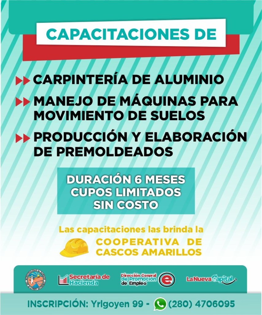 Las capacitaciones tendrán una duración de seis meses y se llevarán adelante de manera gratuita. Las personas interesadas se deben inscribir a través de WhatsApp al número 2804 706095 o en las oficinas de Empleo en Irigoyen 99.