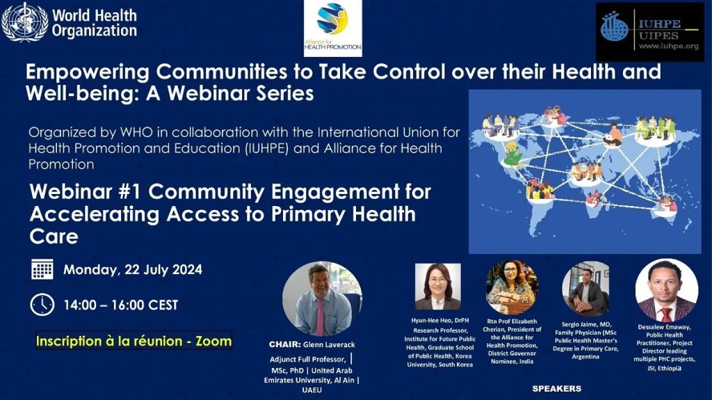 Concretamente y través de la Secretaría de Salud, Chubut participará el próximo 22 de julio del seminario “Empoderando a las comunidades para que tomen el control de su salud y bienestar: Una serie de seminarios web», un evento organizado por la OMS en colaboración con la Unión Internacional para la Promoción de la Salud y la Educación (IUHPE) y la Alianza para la salud.
