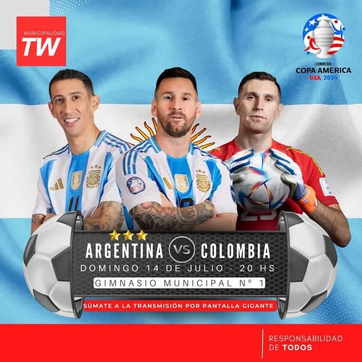 La Municipalidad de Trelew proyectará el partido de Argentina-Colombia, correspondiente a la final de la Copa América USA 2024, en pantalla gigante en el Gimnasio Municipal n.° 1.