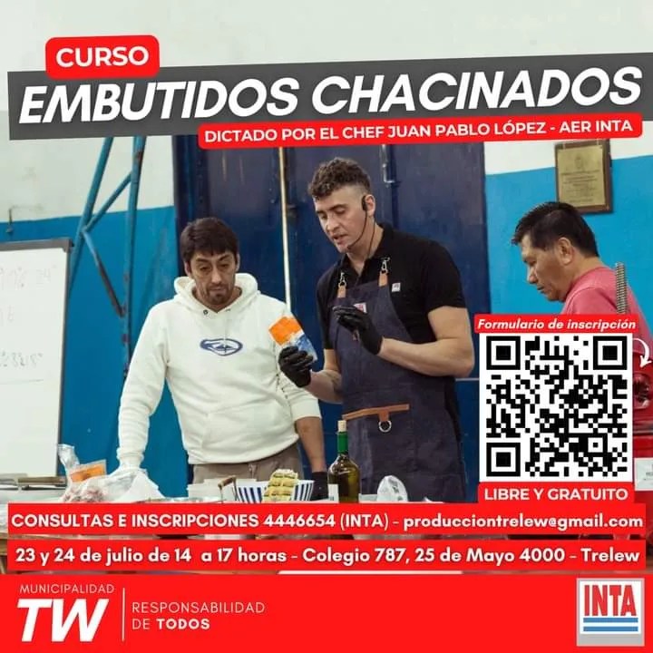 La Secretaría de Producción, Industria, Comercio y Turismo de Trelew, en conjunto con el Instituto Nacional de Tecnología Agropecuaria (INTA), realizará el curso sobre técnicas para elaborar chacinados y embutidos a cargo del capacitador Juan Pablo López.