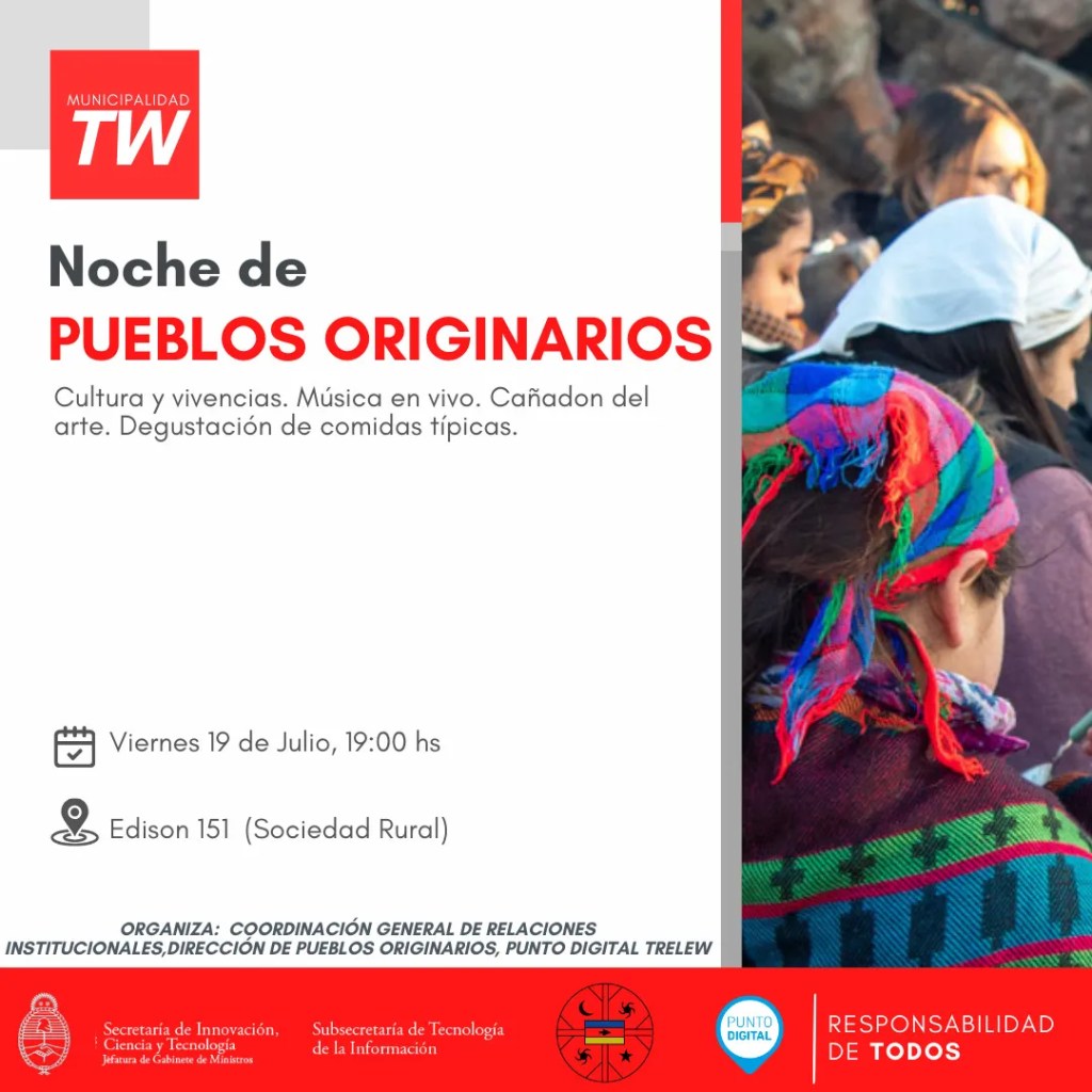 Este viernes 19 de julio, de 19 a 22, se realizará la «Noche de pueblos originarios», un encuentro abierto al público que comprenderá música, arte, cultura y gastronomía.